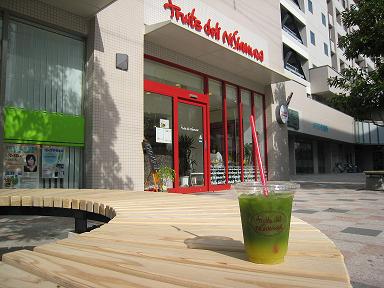 ケールとオレンジのジュース (写真後ろの赤い建物がフルーツデリニシムラさん。)