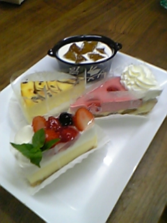 旧藤島町にある、可愛らしいお菓子屋さん。(け・・・携帯の写真じゃ全然良く写ってませんが)部落の外れにちょこんと建っていてこんな立地で人が来るのかな~^^;と思いきやひっきりなしにお客様が・・・知る人ぞ知るお店でございます!庄内って本当に美味しいお菓子屋さんが多くて嬉しいですの~。手前の3つのケーキは全てチーズケーキです。(苺のムースが上に載ってるのもチーズケーキだった様な気がするのですが記憶が曖昧です・・・)奥の紅茶のゼリーが載ってるのは中がババロアの様になってた気がします。(これも記憶が曖昧-w-;)どのケーキもとっても美味しいです。家族で今回は食べたのですが、私が食べたのは一番手前の苺やブルーベリーや木苺が乗ったケーキです。ホイップされたクリームチーズがふんだんに入っててとっても美味しかったです~。ここは、クッキーなんかも売っているのですがクッキー類も美味しいですよん。